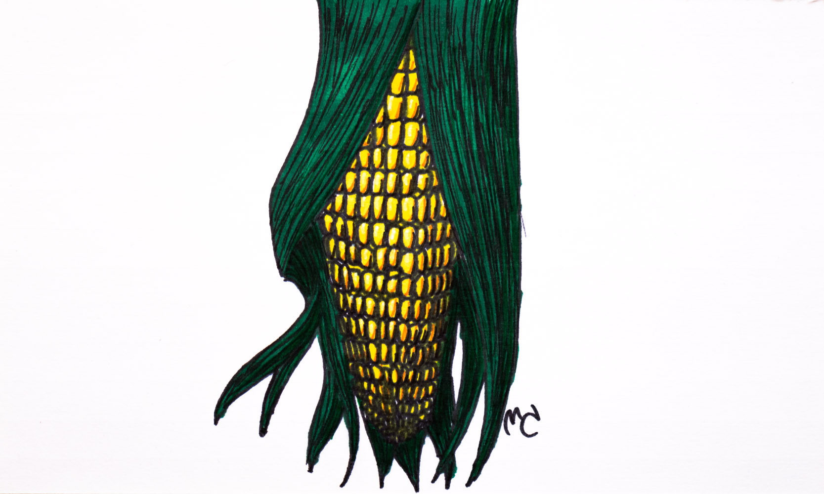 I figured a lot of people were going to be drawing the Husky dog, but I decided to draw corn with its husk instead. I also wanted to try out a bit of color to see how that goes. The new markers I got have so much ink that they bleed a lot more on the paper.