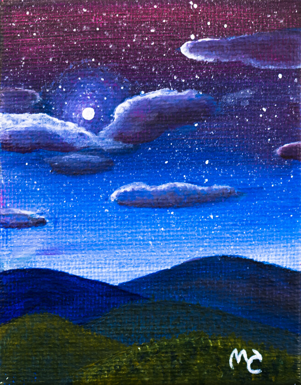 Keywords: mini canvas, painting, art, acrylic, night sky, stars, nighttime, clouds, moon, moonlight, hills, landscape, original artwork, sale, starry night
