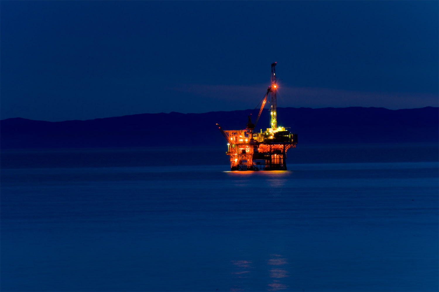 Keywords: photography, art, oil rig, reflection, ocean, water, waterscape, landscape, mountains, ocean, sea, twilight, night, long exposure, ripples, light, shining, blue, orange