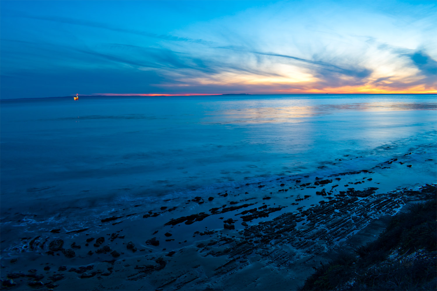 This was taken in Santa Barbara, California. This was around my third time trying to take photos at night, and during twilight. The clouds made the sunset look great, and there was also this really interesting rock pattern down on the beach below. I was standing on a cliff above the beach, so I had a good angle.
